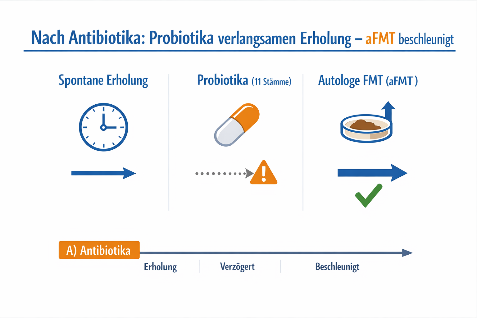 Ob das tatsächlich funktioniert und die Einnahme eines Probiotikums sinnvoll ist, stellen jüngere Forschungen jedoch zunehmend in Frage. In einer Studie an Menschen und Mäusen, in der ein Teil der Probanden und Tiere entweder keine weitere Maßnahme, ein Multi-Stamm-Probiotikum oder eine autologe fäkale Mikrobiota-Transplantation (aFMT = eigener Stuhl vor der Antibiotika-Behandlung) erhielten, konnten zeigen, dass die Probiotika-Gruppe im Schnitt eine langsamere Rückkehr des individuellen Darmmikrobioms erreicht als die Gruppe ohne Probiotika. Spannend dabei war, dass die besten Ergebnisse von der Gruppe erzielt wurde, die aFMT erhielt – bei ihnen kehrte das Darmmikrobiom am schnellsten in ihren Ursprungszustand zurück.