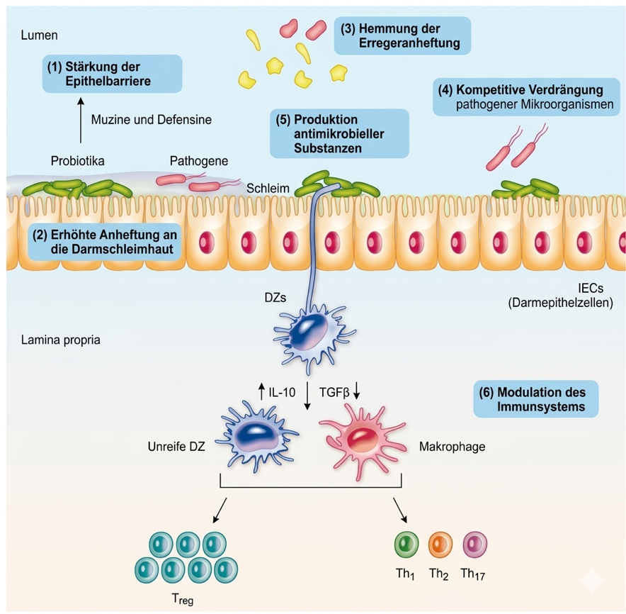 Auch wissen wir heute, dass probiotische Keime für ihre Wirkung nicht zwingend lebendig im Darm ankommen müssen. Zellwandbestandteile bereits abgetöteter probiotischer Bakterien können bspw. wertvolle Signale an Immunzellen aussenden, die sich in großer Zahl in der Darmwand befinden. Aus diesem Grund spricht man auch vom Darm als Sitz des Immunsystems. Die Zellwandbestandteile der Bakterien sind in der Lage Immunzellen so zu trainieren und zu modulieren, dass es zu wünschenswerten Veränderungen innerhalb des Immunsystems kommt. Auch können nicht mehr lebende Probiotika helfen, die Darmbarriere, also die Zell-Zell-Kontakte zwischen den Darmepithelzellen, zu stabilisieren.