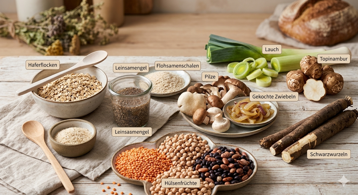 Oft empfohlene Quellen für lösliche Ballaststoffe sind eingeweichte und/oder gekochte Haferflocken, eingeweichte Chia- und Leinsamen, Flohsamenschalen, Pilze, gekochte Zwiebeln, Lauch, Topinambur, Schwarzwurzeln, Hülsenfrüchte sowie konzentrierte Ballaststoffpulver, die Pektin, Fructo-Oligosacchariden (FOS), Galacto-Oligosacchariden (GOS), Inulin, Akazienfaserpulver oder ß-Glucan enthalten.